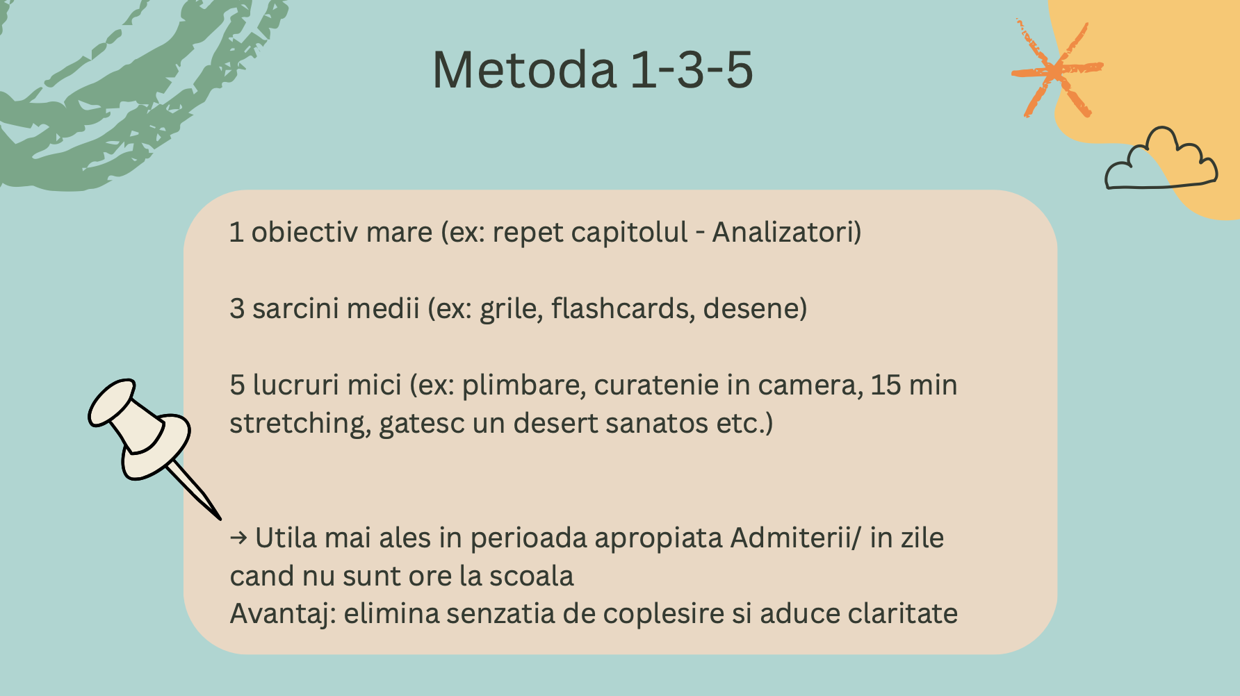 În perioadele intense, poate fi greu să privești o listă lungă de sarcini. Metoda 1-3-5 simplifică totul: un obiectiv mare, trei sarcini medii și cinci lucruri mici.