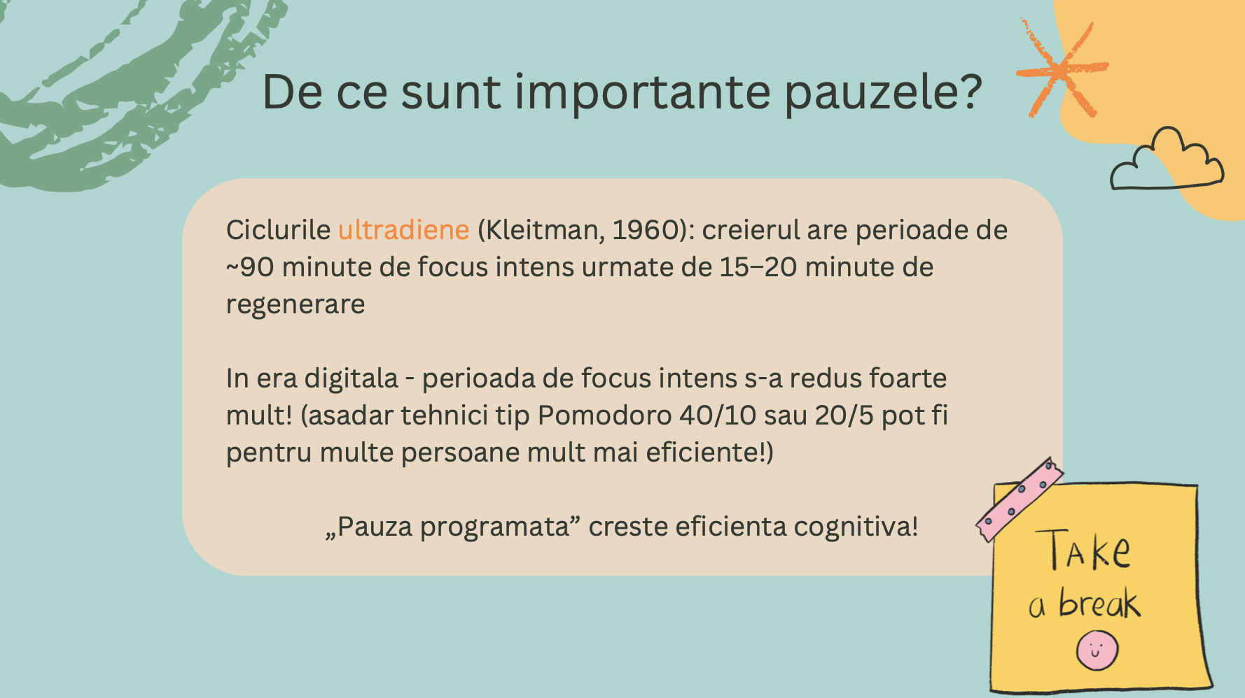 Pauzele sunt parte din performanță, nu piedici în calea ei. Creierul funcționează în cicluri naturale: perioade scurte de focus intens urmate de perioade de regenerare. Dacă le ignori, randamentul scade, iar frustrarea crește. Somnul este, poate, cel mai subestimat element al pregătirii. O oră de somn pierdută poate să reducă eficiența cognitivă cu până la 20% (Walker, M. (2017)–„Why We Sleep”). Uneori, cel mai productiv lucru pe care îl poți face este să dormi. :)