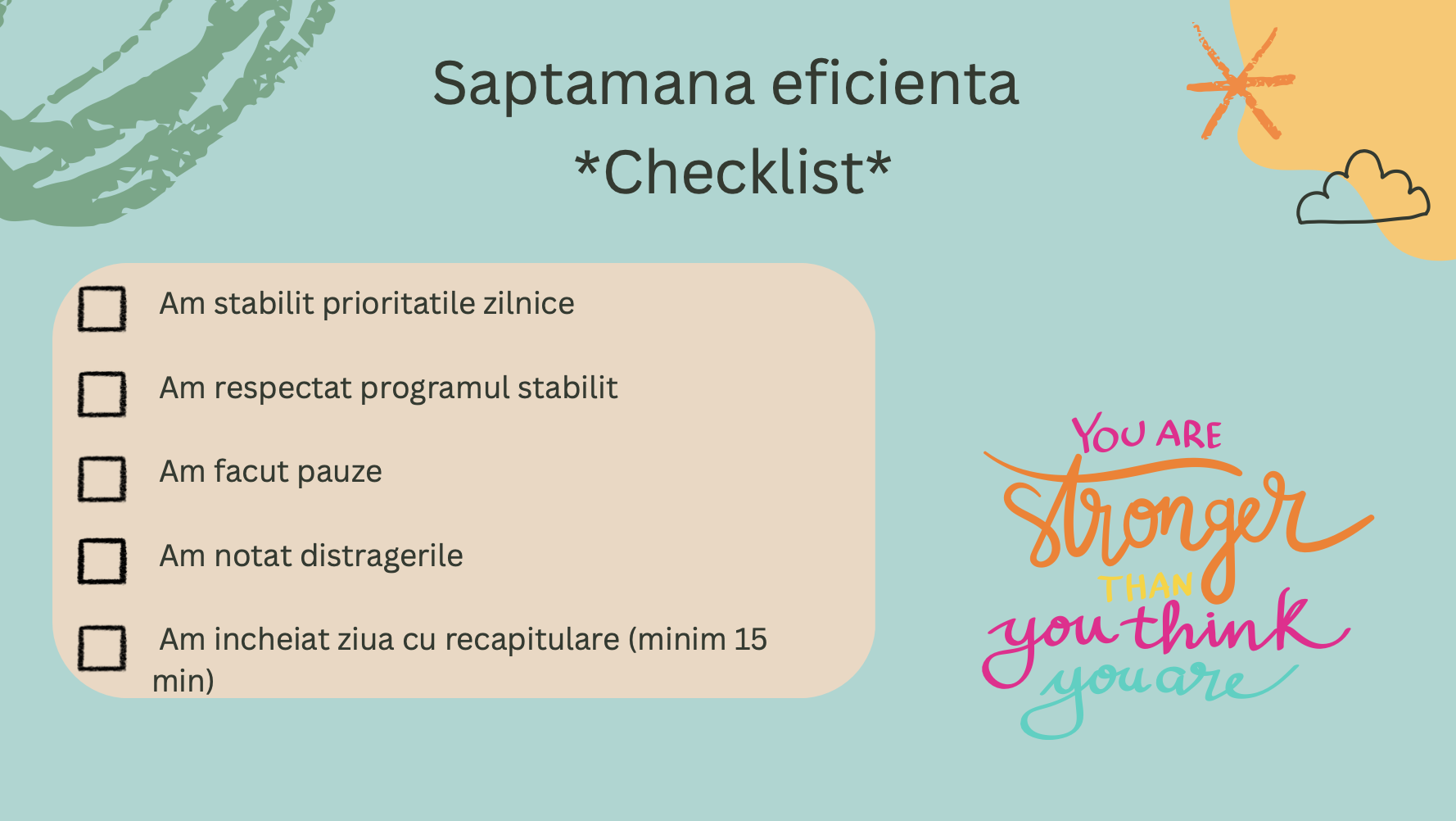O săptămână eficientă nu este cea în care bifezi totul perfect. Este cea în care îți cunoști limitele, îți protejezi energia, te organizezi și închei fiecare zi cu câteva minute de recapitulare. Este o săptămână în care faci echipă cu timpul, nu lupți împotriva sa. Gestionarea timpului este despre echilibru. Nu trebuie să strecori totul în 24 de ore, ci să înveți cum să îți construiești progresul în ritmul potrivit.