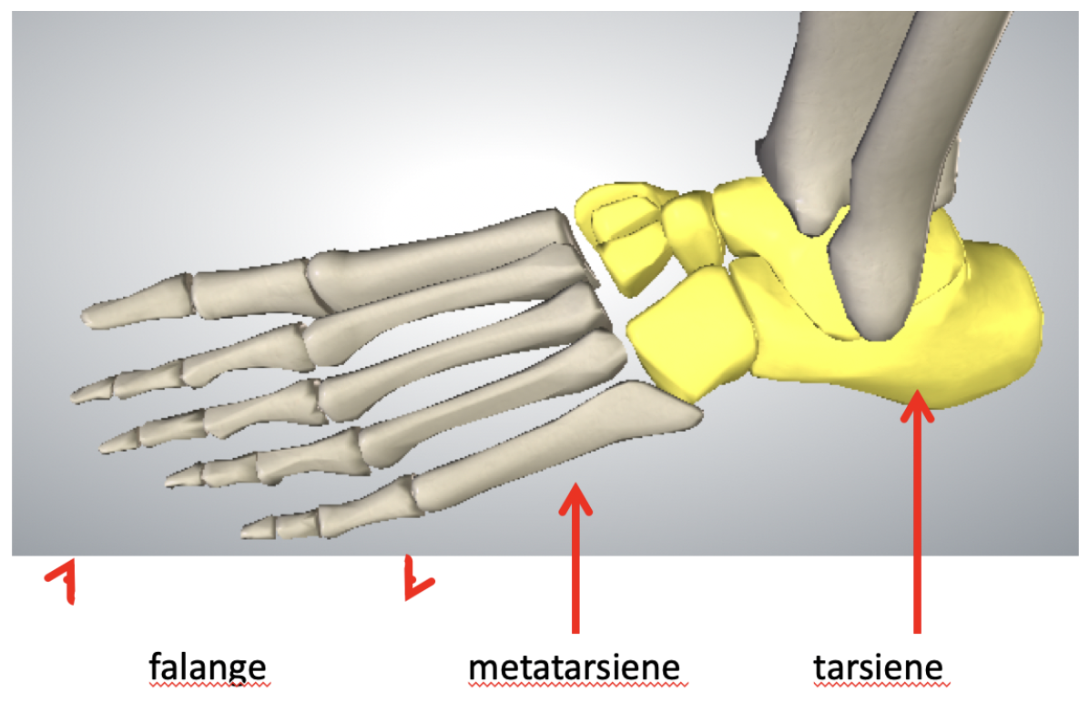 7 oase tarsiene, 5 oase metatarsiene, 14 falange (numai două pentru degetul mare).