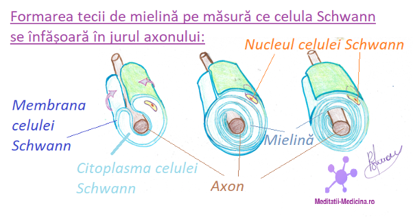 Mielina din SNP este produsă de celulele Schwann (mai multe celule Schwann pentru un singur axon).