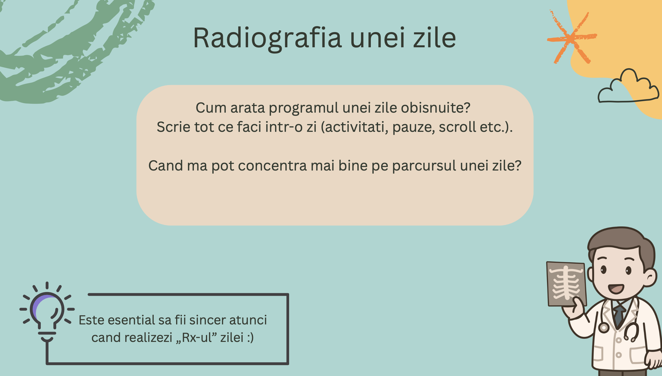 Primul pas pentru a îți înțelege propriul ritm este să îți observi ziua așa cum este ea. Notează ce faci într-o zi obișnuită de dimineață până seara: ce activități ai, când pierzi timp, când te concentrezi, când obosești, când ai momente în care nu ai chef de nimic.