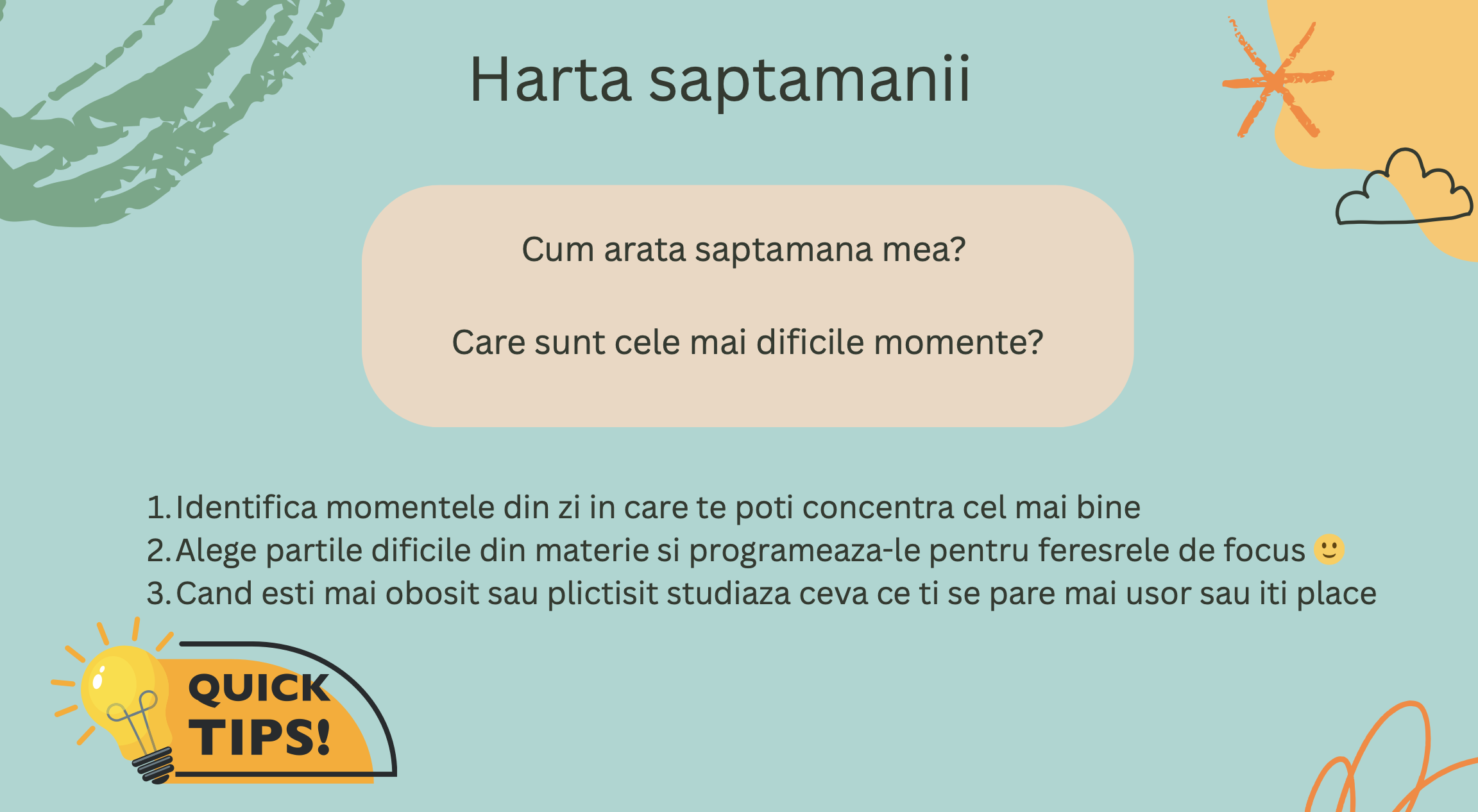 După ce ai înțeles cum arată o zi obișnuită, devine mai ușor să construiești o săptămână realistă. Scopul nu este să faci o planificare perfectă, ci una adaptată ritmului tău.