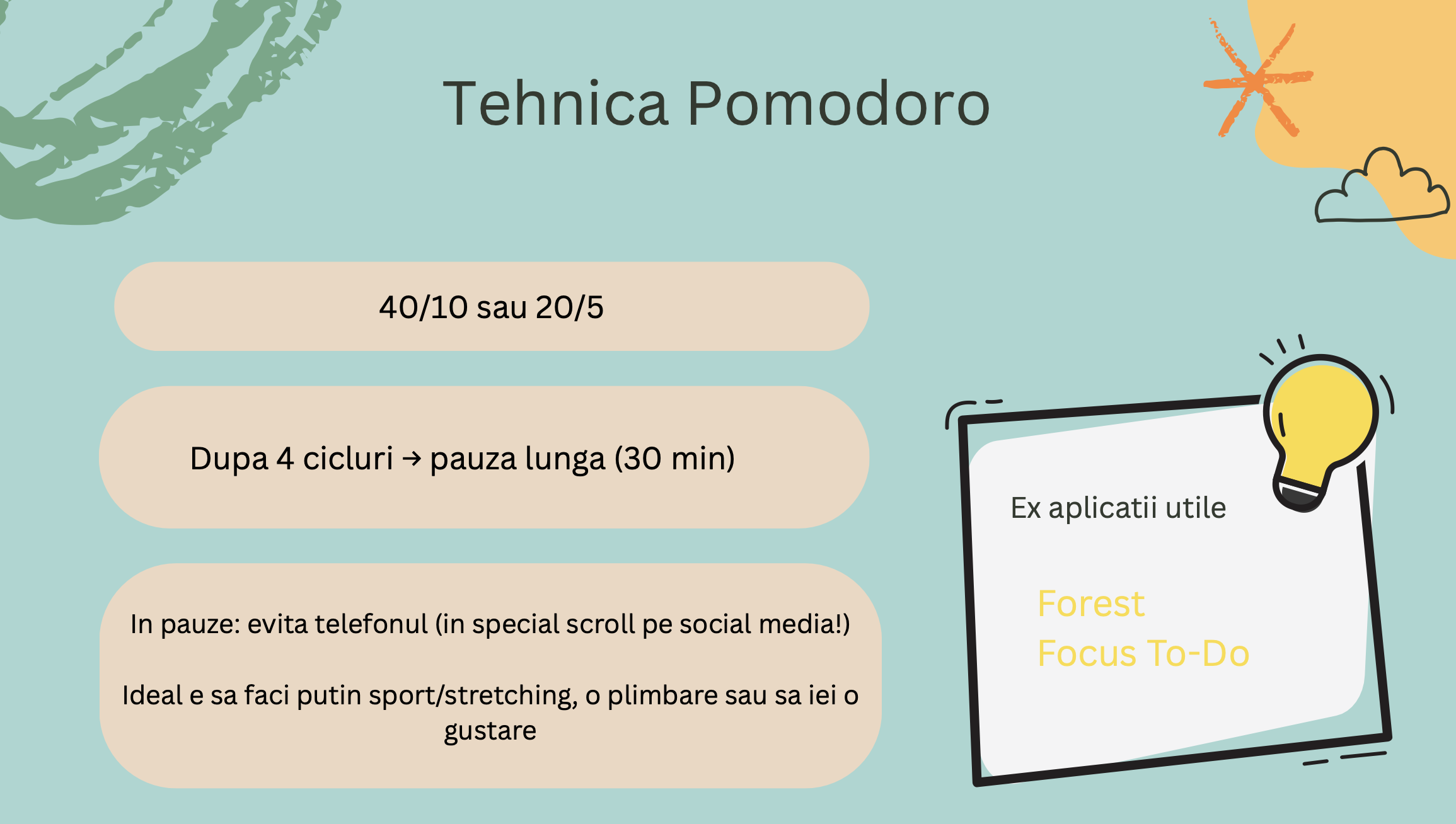 Tehnica Pomodoro (40 minute de focus cu 10 minute de pauză ori 20 minute de focus cu 5 minute de pauză) funcționează pentru că oferă structură. Perioadele scurte de focus, urmate de pauze reale sunt mult mai eficiente decât două ore de învățat forțat, cu multe momente în care mintea parcă “fuge” oriunde în altă parte.