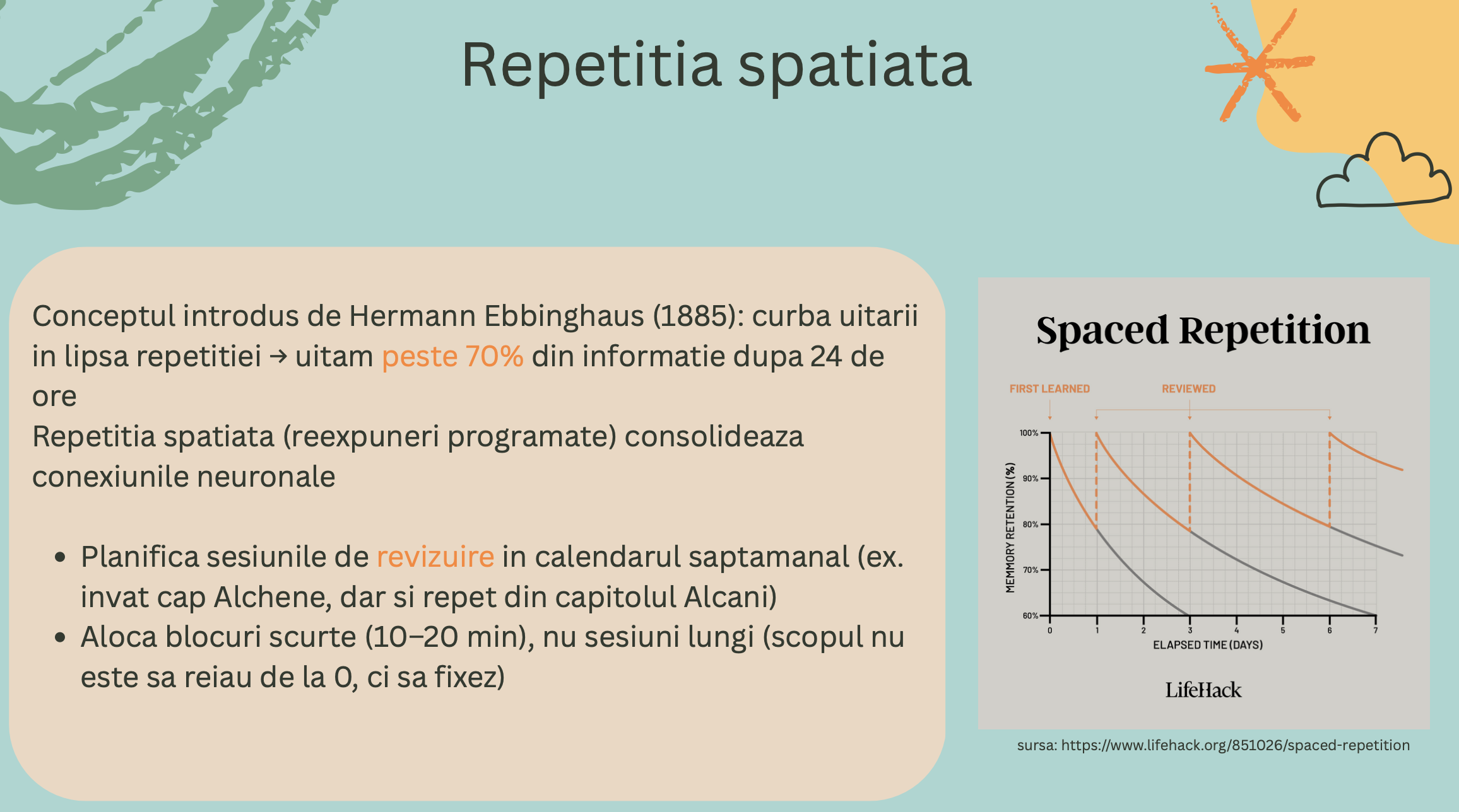 Chiar dacă simți că ai înțeles și reținut un capitol, creierul uită o mare parte din informație dacă nu o repeți. De aceea repetiția spațiată este esențială. Nu trebuie să reiei totul de la zero, dar o recapitulare scurtă la câteva zile este suficientă pentru a consolida informația pe termen lung.