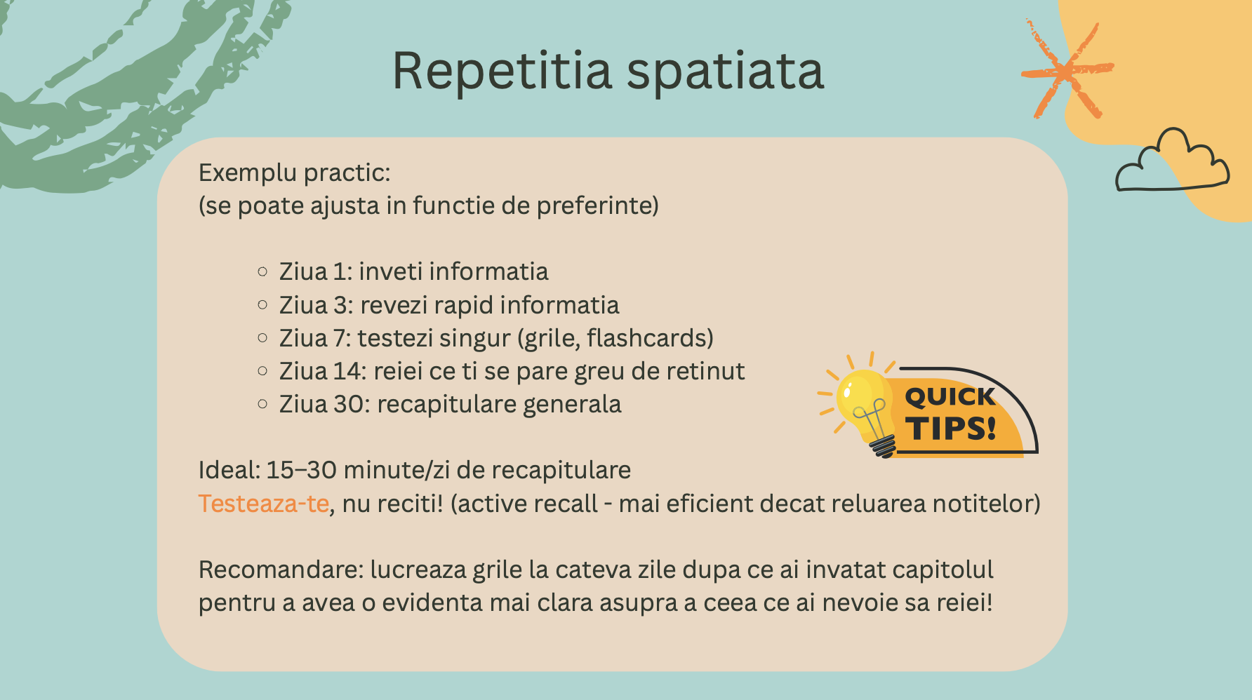 Repetiția activă (de exemplu prin grile sau flashcards) este mult mai eficientă decât recitirea. În loc să „recunoști” informația, o reconstruiești și te asiguri că ai reținut, iar asta fixează cu adevărat cunoștințele.