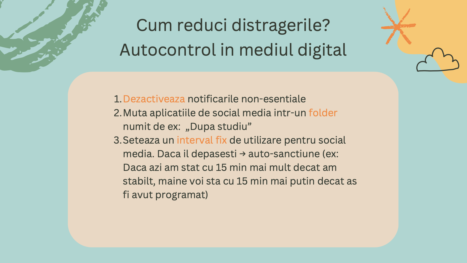 Distragerile, mai ales cele digitale, sunt inamicul tăcut al învățării. Nu telefonul în sine este problema, ci utilizarea lui constantă. Dezactivarea notificărilor, ascunderea aplicațiilor și stabilirea unui interval clar pentru social media te ajută să-ți păstrezi focusul.