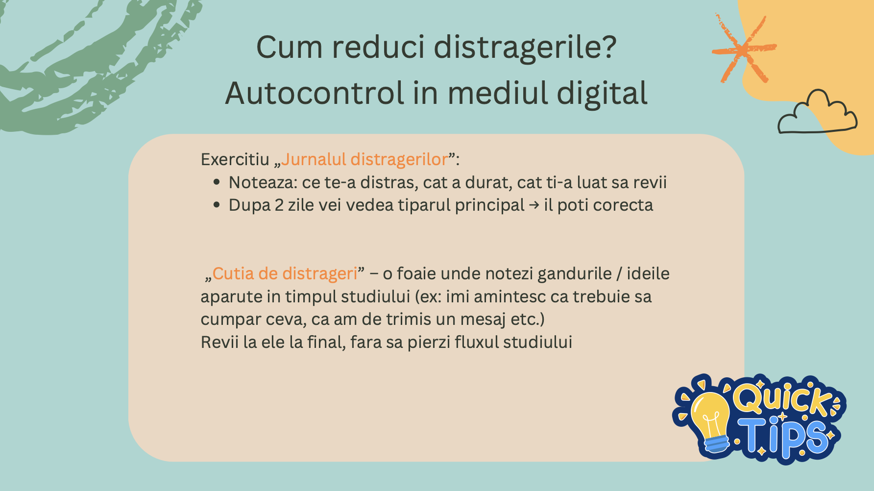 Un exercițiu util este „jurnalul distragerilor”: notează ce te-a distras și cât ți-a luat să revii. În câteva zile vei observa tipare clare și vei putea interveni exact acolo unde este nevoie.