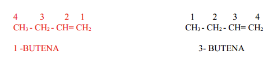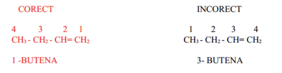 ⚠ Se numerotează catena cea mai lungă începând de la capătul cel mai apropiat dublei legături, indiferent dacă aceasta este în partea stângă sau dreapta a formulei;